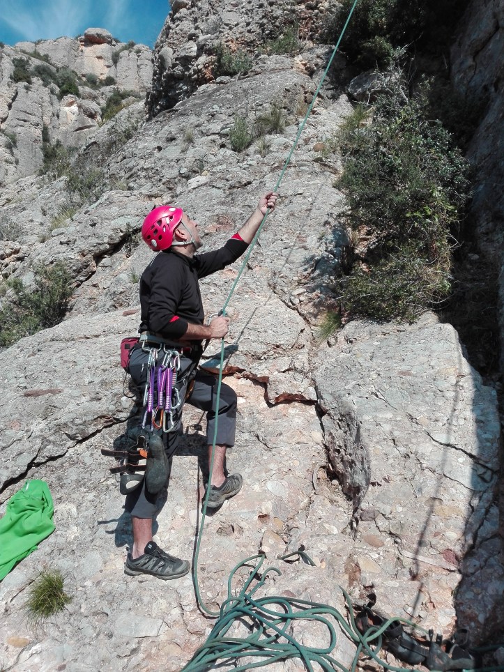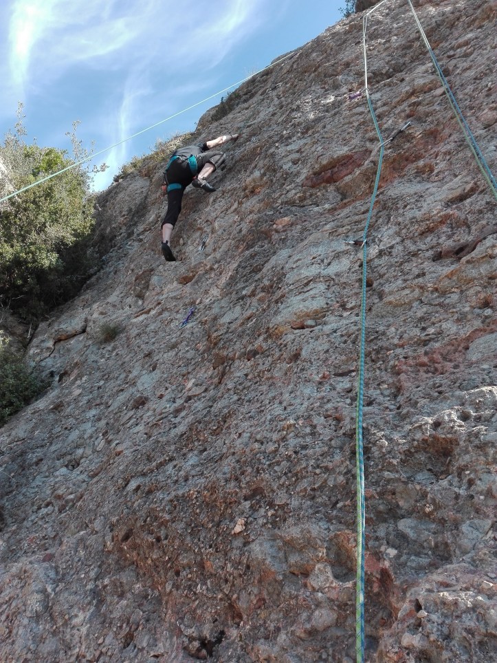 Las vias de la derecha son las mas sencillas, placa algo tumbada con buenos pies, muy montserratino, a la izquierda ya hay un par de vías Trencaclosques 6a+ y Tamborraju 6a que requieren algo mas de esfuerzo. Pero el Sr Flojo esta fuerte y las encadena todas sin dudar.