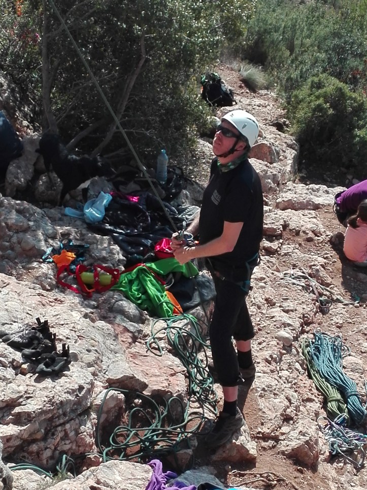 Hemos pedido prestados unos pies de gatos, para poder escalar un poquito mas comodos. Ya en el sector, como el único que sabe escalar un poco es el Sr Flojo, despues de unas cortas lecciones, nudo del ocho, asegurar con grigi o reverso etc. Nos ponemos en faena, llevamos varias cuerdas así que montamos dos vías para poder escalar dos a la vez.